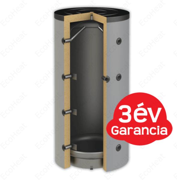 Ellenőrzött minőségű acéllemezből készülő f űtési puffer tároló tartály 1000 liter űrtartalommal, melynek a magas szintű hőtároló képességét a 100 mm vastagságú levehető lágy PU szigetelés és a puffer tartályt kívülről teljes egészében lezáró PVC borítás garantálja.